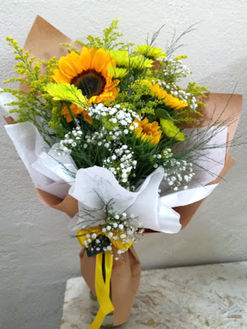 Composição 3 girassóis, samambaias, tango, gypsphila, em embalagem especial com papel kraft, papel de seda e laço