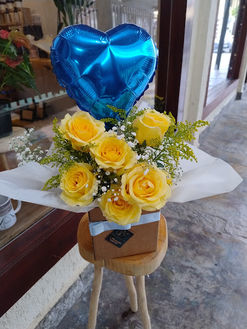 Composição: 1 caixa de 8 bombons Ferrero Rocher, 1 rosa ou girassol com tango e balão de coração, acabamento em laço